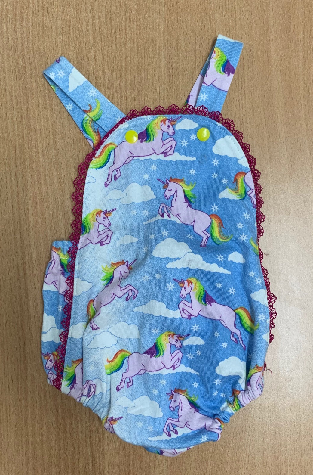 With a purple laced trim this unicorn print romper is sized for babies from 1 to 3 months of age.