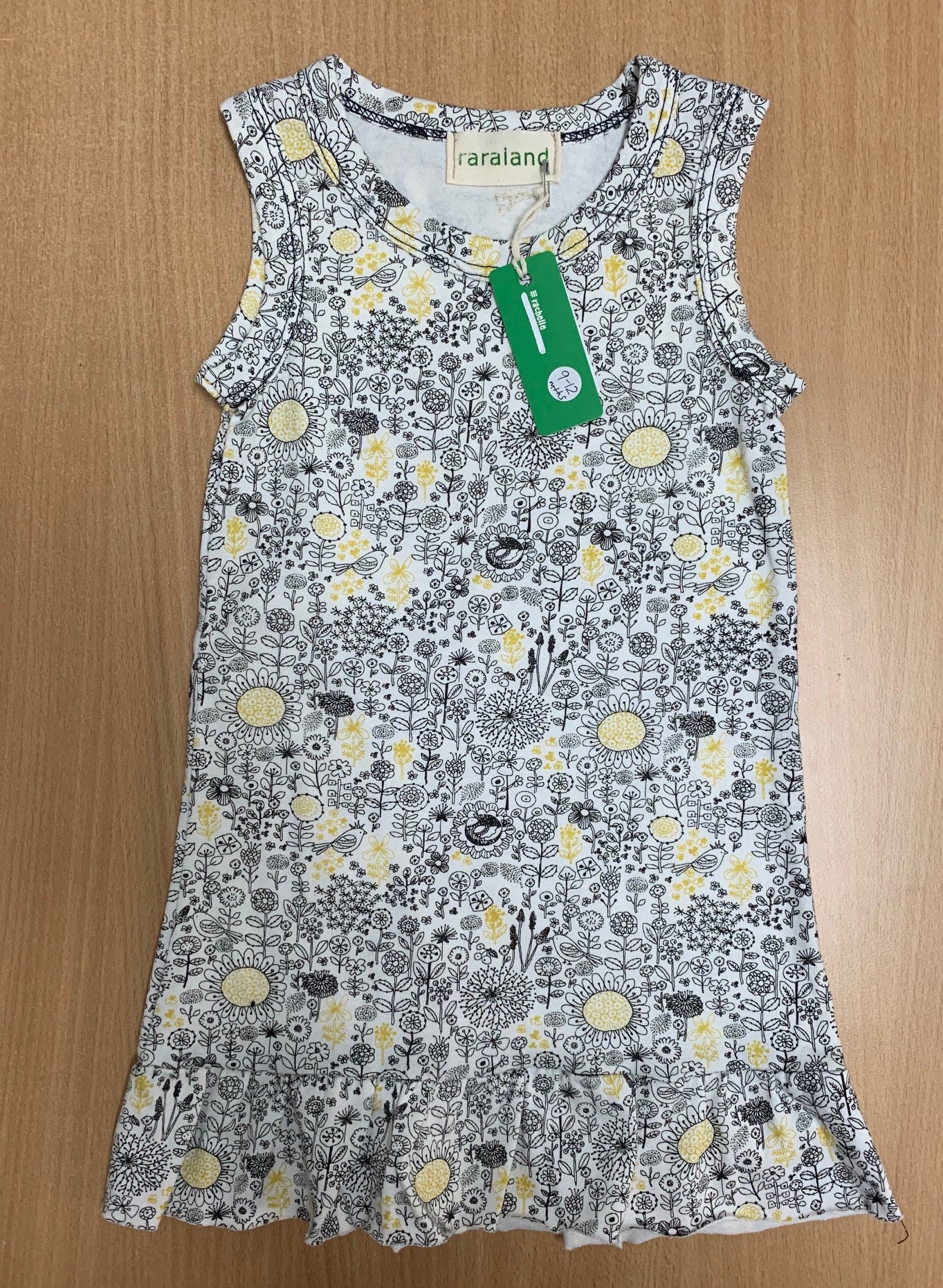 This fine detailed floral printed dress in Black, White & Yellow is sized for girls from 9 - 12 months.