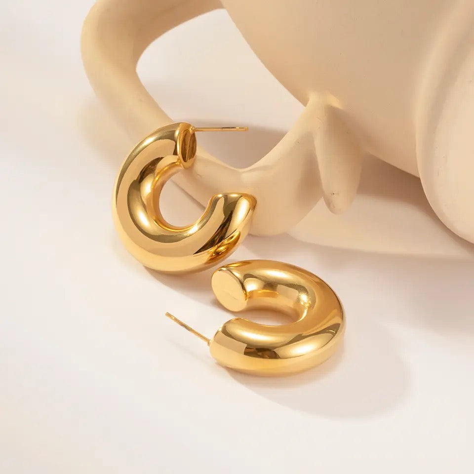 Elevate your style with the Margo Chunky Hoop Earrings. Made with stunning gold plating, these statement earrings are the perfect addition to any outfit. The stainless steel material makes them hypoallergenic, ensuring comfortable wear every day. At 30mm, they are the perfect size for making a bold statement.