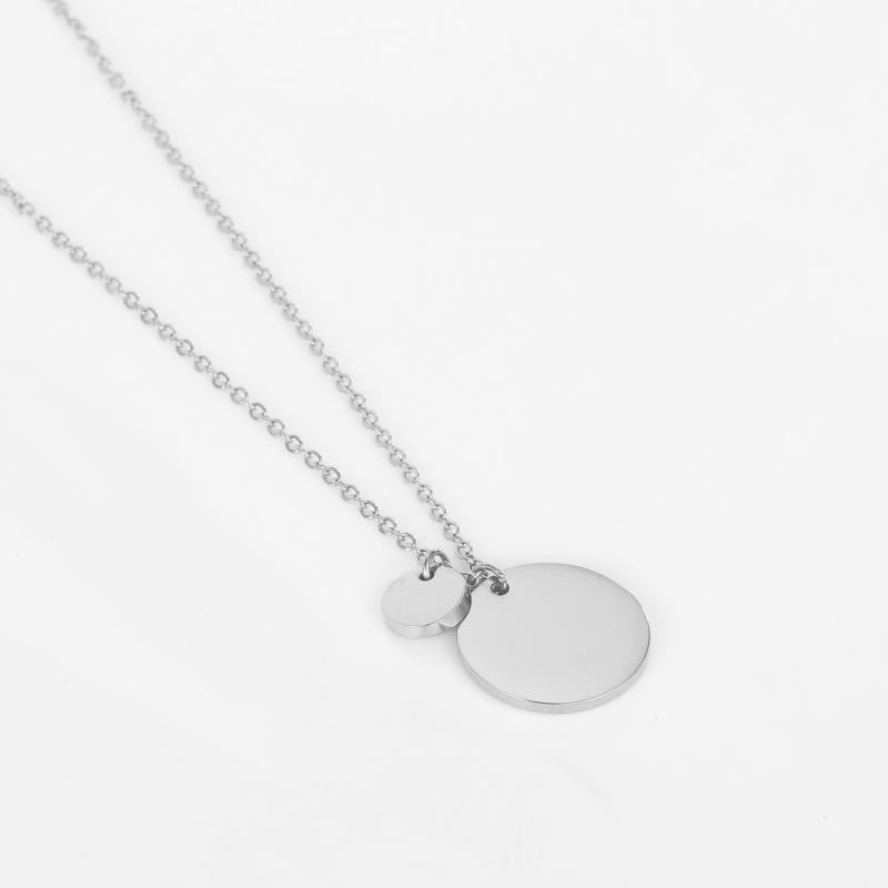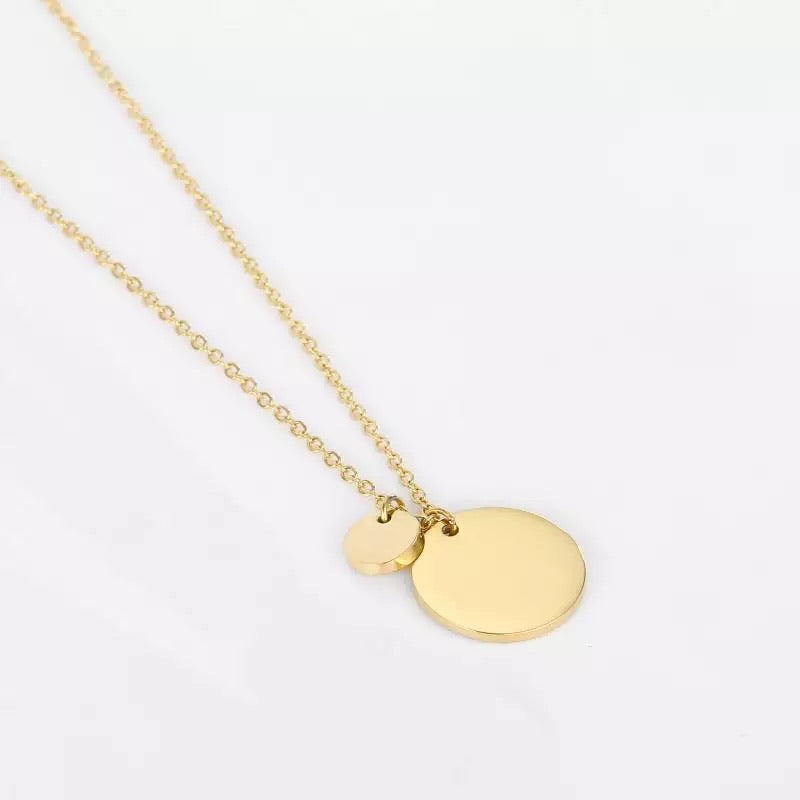 Elevate any outfit with the Elle Necklace. This stunning double disk charm necklace, available in silver or gold plated stainless steel, is perfect for everyday wear. The large and small disk charms, along with the 42cm chain plus 8cm extension, add a touch of elegance and sophistication.