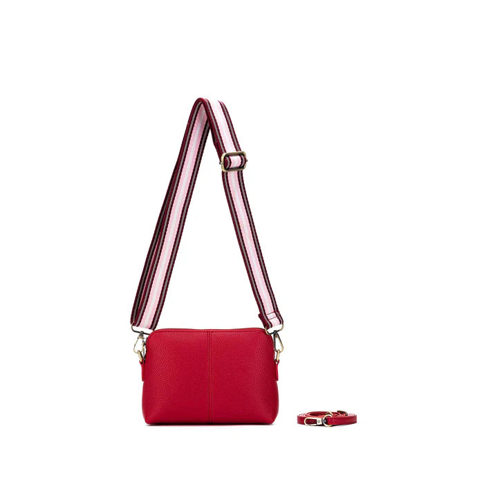 CLOSURE: Zip INTERNAL FEATURES: Includes 1 zip pocket and 3 cardholders EXTERNAL FEATURES: Features an open back pocket for easy access to items INCLUDED: Comes with a long adjustable crossbody PU strap and an additional Cotton strap HARDWARE: Brushed gold LINING: Lined with black and white cotton Lx22, Hx13, D6cm