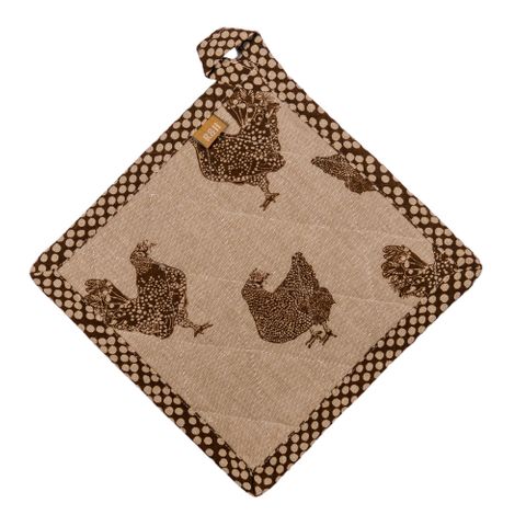 You will love having the Henrietta chicken trivet in your kitchen. Add fun while protecting your hands and surfaces with this reversible trivet/potholder. Henrietta Chicken pattern reverses to an Earth brown speckled pattern with a handy loop. Made of sustainable 100% cotton. These trivets are ethically made with a commitment to reduce global footprint.