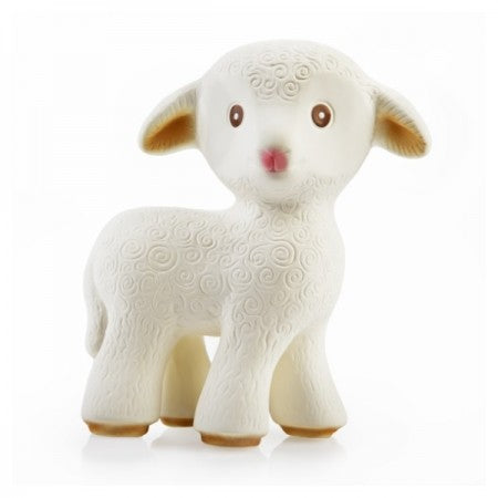 Mia the Lamb or Sola the Goat. Each toy comes with surface textures that encourage tactile exploration while their ears and legs are shaped to act as a soother for mouthing babies. Sola the Goat squeaks when gently squeezed while Mia the Lamb is hermetically sealed. 100% pure and natural rubber.
