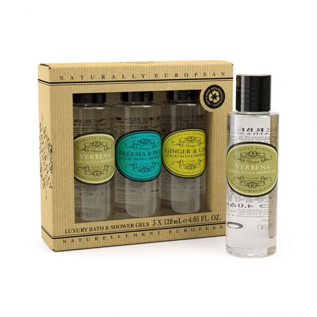 Indulge in the luxurious world of the Naturally European range with this collection of three 120ml Shower Gel bottles, infused with the invigorating scents of Ginger & Lime, Verbena, and Freesia & Pear.