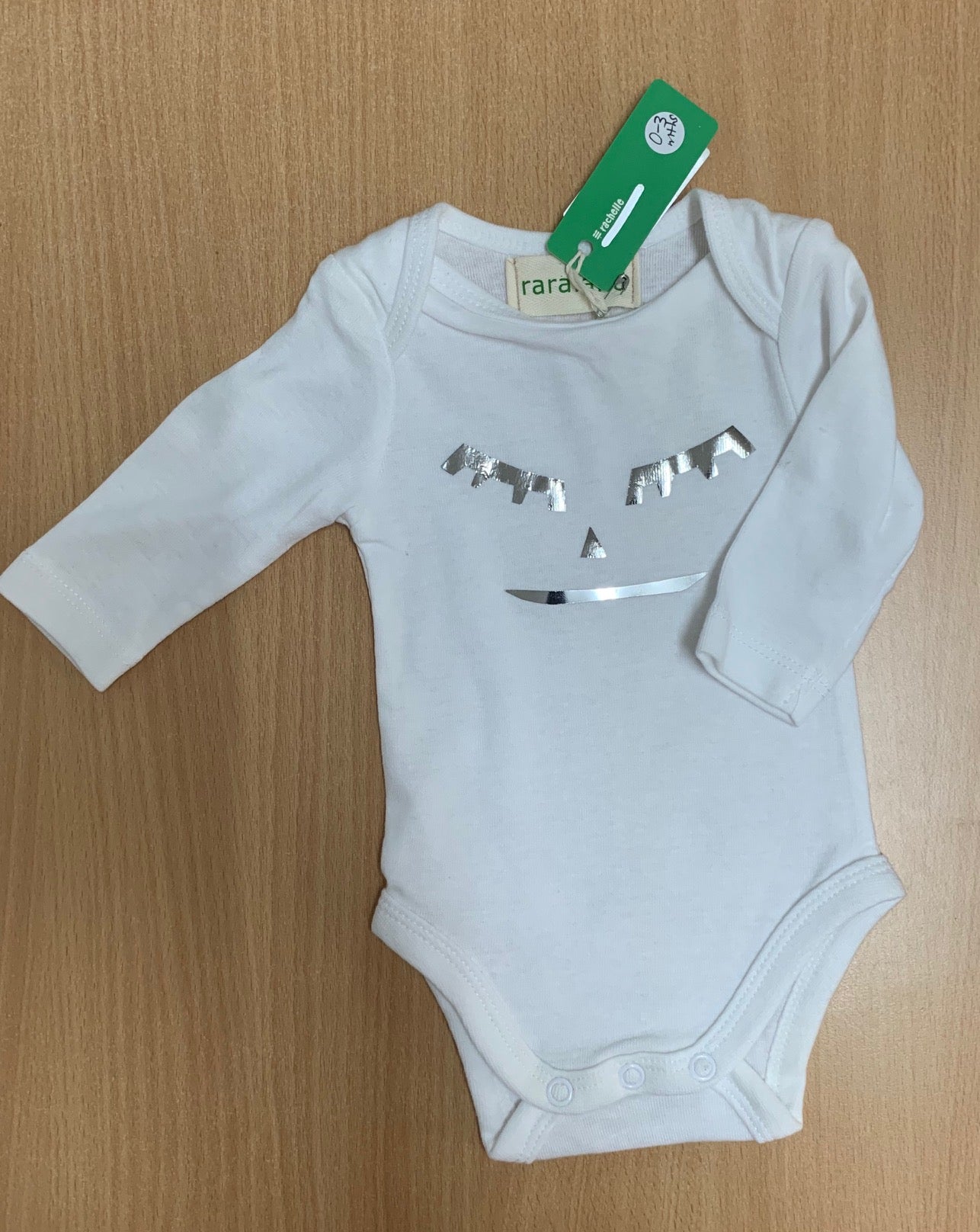 This White onesie with a Silver Face Decal is sized for babies from birth to 3 months of age.