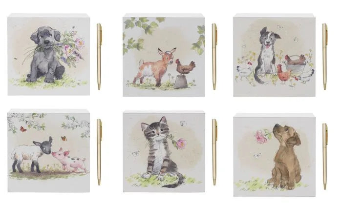This 14x14x3.5cm notepad features a charming cover adorned with a variety of farm animals, making it a delightful choice for jotting down your notes.