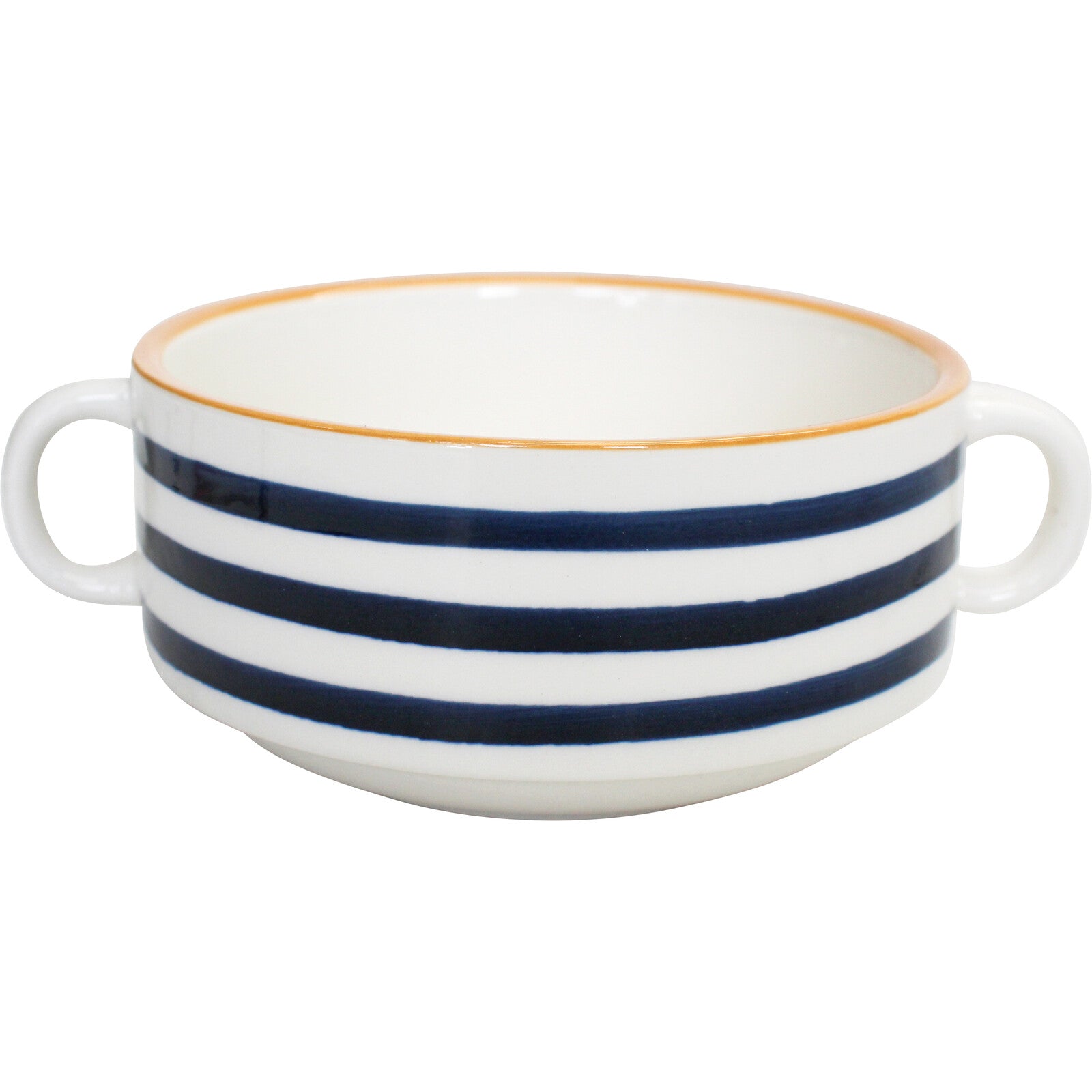 Indulge in your favorite soup with this comforting striped mug. Crafted from quality ceramic and boasting a navy stripe with mustard trim, you'll love its sophisticated allure. Elevate every meal with timeless style.